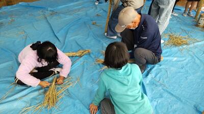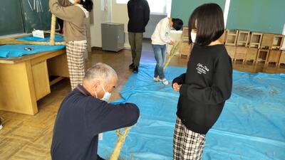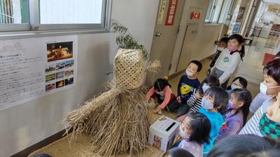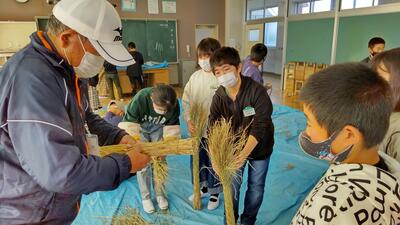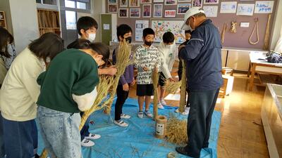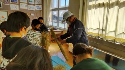 5年生は、総合的な学習の時間に米作りを行っています。今回は、収穫後のわらの活用ということで、ぼうじぼ作りを行いました。ぼうじぼの由来を話していただいた後、実際にぼうじぼを作りました。最初は戸惑っていたこどもたちもすぐにわらの使い方に慣れ、シニアクラブの方々の指導を受けながら、楽しく活動していました。