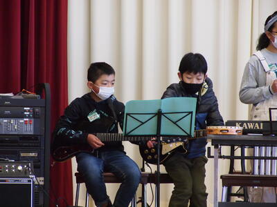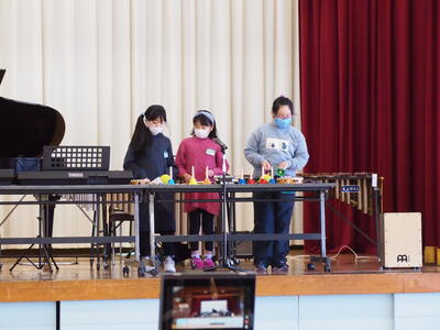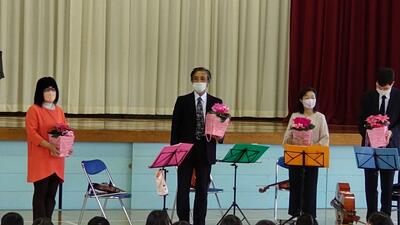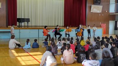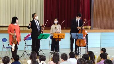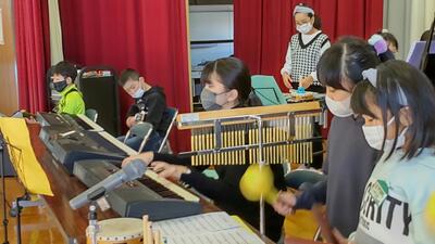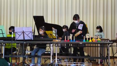 音楽の授業で学習した曲や、テレビ番組、CMでお馴染みの曲などを演奏してくださいました。ウッドブロックや犬や猫の鳴き声で、子どもたちも演奏に参加させていただきました。
