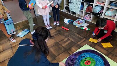 このふれあい学習は、地域の方々に昔の遊びを教えていただく活動を通して、友達や地域の方々と楽しく活動することを目的としています。
