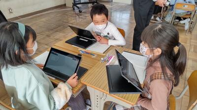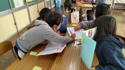 4年生は「国語」の時間です。グループごとに友達のパンフレットのよいところを交流しています。