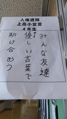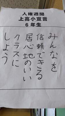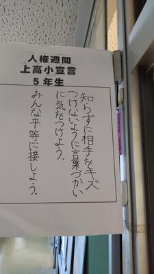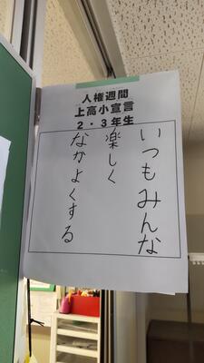 早速、教室の入口には、クラスで考えた「上高小宣言」が掲示されました。人権週間中、朝の会でクラスの標語を確認し、帰りの会で振り返ります。