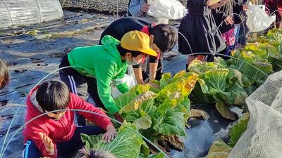 全学年で白菜の収穫ができました。野中さんの指導を受けながら大切に育ててきた白菜が大きく成長し、収穫する日を迎えることができました。