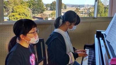 2年生「音楽」です。鍵盤ハーモニカで「こぎつね」を演奏しています。タンギングが少し難しいようです。