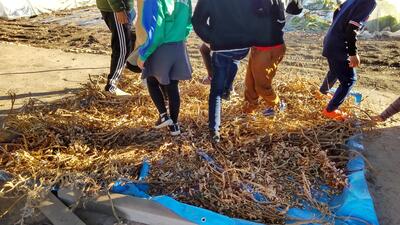 3年生は、「総合的な学習の時間」です。大豆を鞘から取り出す作業です。大豆は、どんな姿に形を変えていくのでしょうか。