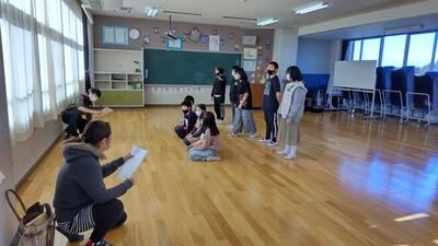 「国語」は、昔話を上高バージョンで再現します。舞台袖からの動き、せりふ、立ち位置を話し合いました。