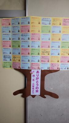「上高小人権週間」に作成した「ありがとうの木」です。この「ありがとうの木」を、今後常設することで、本校の目指す児童像のひとつである「感謝する子」を目指して、お互いのよさを認め合える温かい学級づくりを行い、自分や友達、みんなを大切にする子を育てていきたいと思います。