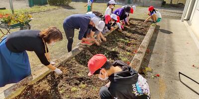 本校の卒業生である中山様のご尽力により「花の輪運動」でいただいたパンジー、ビオラ、キンギョソウ、ノースポールを、ふれあい班ごとに協力して定植しました。5年生6年生がリーダーとなり下級生に、植え方や植える位置を説明しました。水やりをし、苗の根元までしっかり植えることができたか確認できたでしょうか。