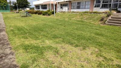 先週の土曜日に、見目智史PTA会長さんが校庭の芝刈りをしてくださいました。今週5日(土)の環境整備作業に先立ち、教頭とともに整備箇所を確認しながらの作業でした。ありがとうございました。
