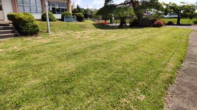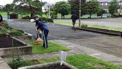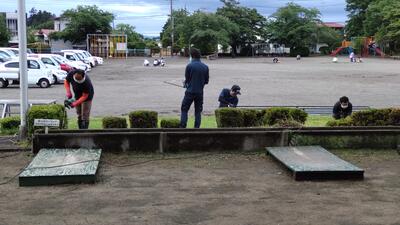 また、9月25日に実施予定だったPTA親子環境整備作業が、新型コロナウィルス感染症拡大防止にかかわる緊急事態宣言延長のために中止となったことを受け、PTA会長さんを中心に執行部、専門部長副部長の皆様が、校舎前の芝刈り、校庭の除草等を行ってくださいました。