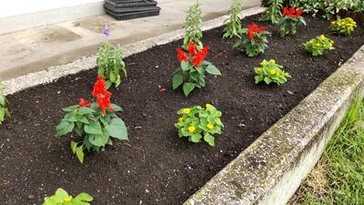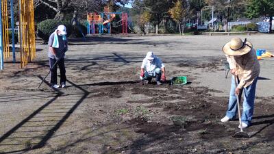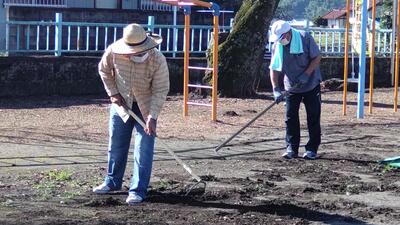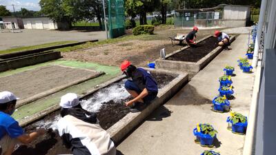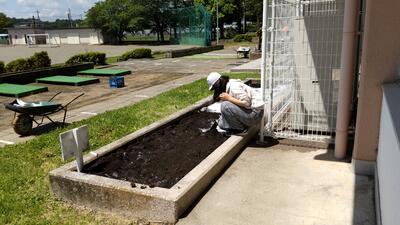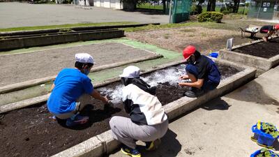 ふれあい花壇へのマリーゴールドとサルビアの植え付けの前に、6年生が肥料を入れて耕す作業をしてくれました。