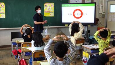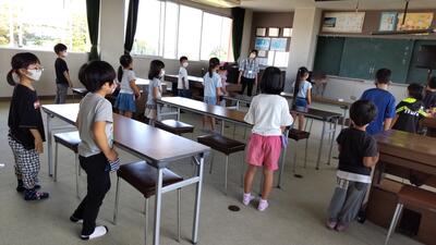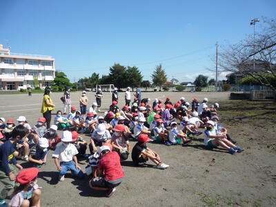 本日、子どもたちには、日時を伝えない形での避難訓練を実施しました。業間の休み時間に地震が発生したという想定で実施しましたので、活動場所は様々でしたが、落ち着いて行動することができました。
