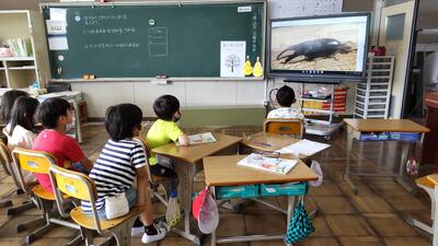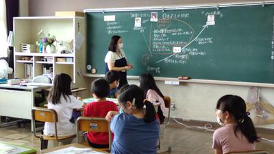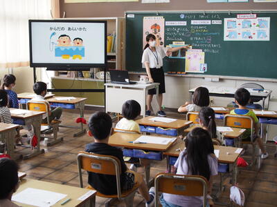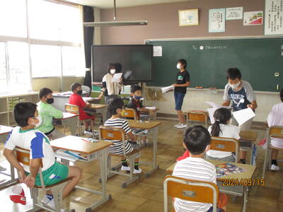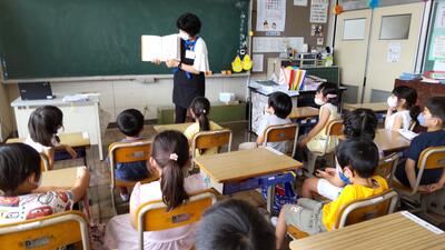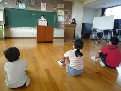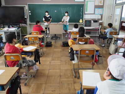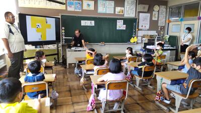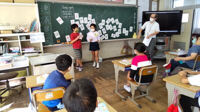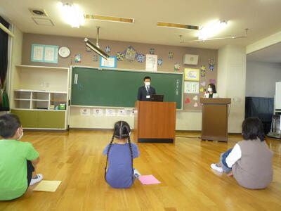 先日、幼小連携事業の一環として、1年生において研究授業(「国語科(うみのかくれんぼ)」)を行いました。のびのび保育園から2名の先生に参加していただきましたが、保育園当時に比べ、一回りも二回りも大きく成長した姿に感心されていました。