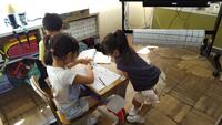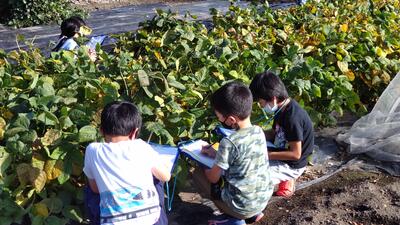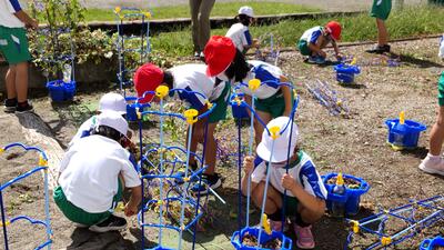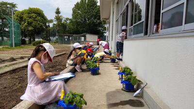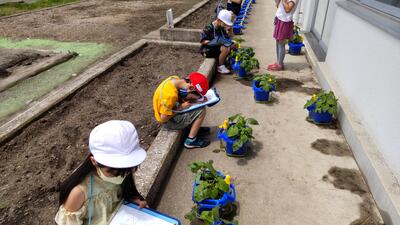 1年生はアサガオの観察をしています。アサガオの植木鉢をみつめるどの子の顔も真剣です。葉っぱの色や形の違い、1週間前に観察した時とは何が変わっているのか、観察カードに記入しています。