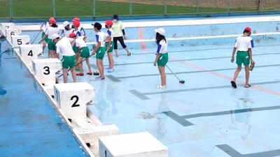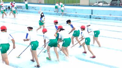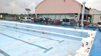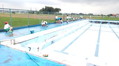どの子も真剣な表情で、ブラシ使って磨いていました。活動開始から約1時間、プールの清掃が終了しました。自分たちが使うプールを自分たちできれいにすることで、水泳授業もより待ち遠しくなりました。