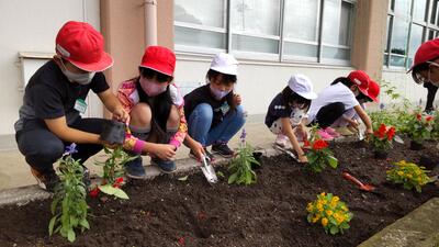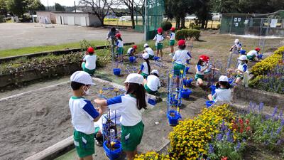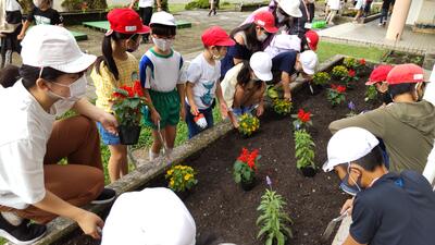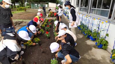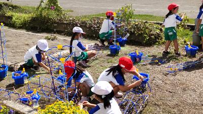 今日の朝の活動は、ふれあい花壇への花植えでした。レッドサルビア、ブルーサルビア、メランポジウムの苗を植えました。ふれあい班の5年生6年生が、1年生2年生に植え方を手を取りながら教えていました。3年生4年生は、水やりやスコップの片付けを手伝っていました。