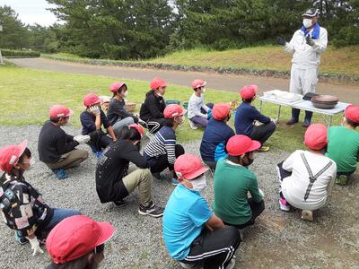 5年生が「総合的な学習の時間」に、稲刈りを行いました。芽出し、苗床作り、田植えと取り組んできた米作り体験ですが、小さかった苗も大きく育ち、収穫の日を迎えることができました。
