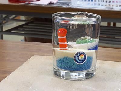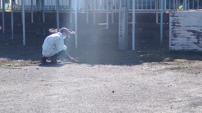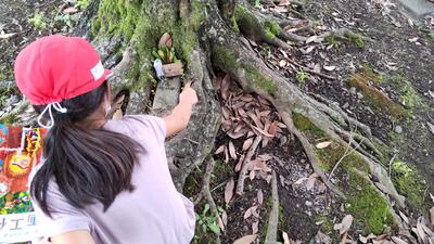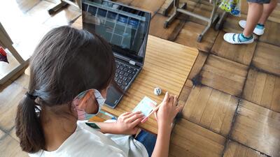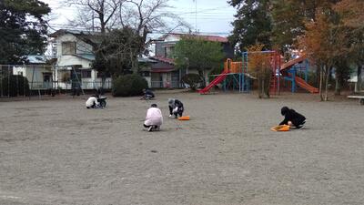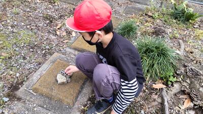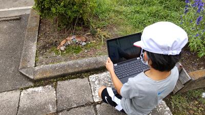 3年生は「図工」の時間です。「小さな自分」を作って校庭の中に楽しい場所を作りました。校庭にある木々や葉っぱなどの材料も工夫して使います。こうして完成した「楽しい場所」を、タブレットで撮影しました。撮影中に「カエル」さんと目が合ってしまうことも。