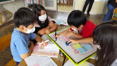 2年生は、生き物探しの計画を立てています。いろいろな生き物の様子をデジタル教科書で確かめています。どんなところに行くと見つけられるのかな。