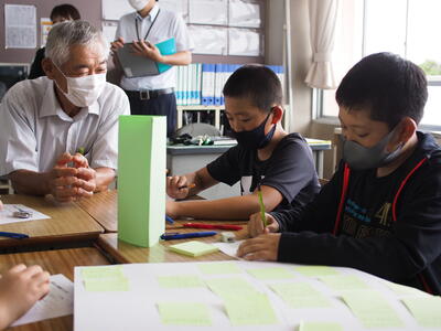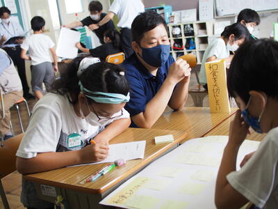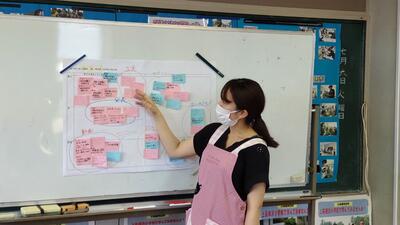2年生は「国語」の授業です。感想を伝え合うための発表です。感想を、付箋に記入しています。