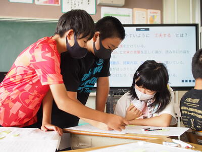 5年生は、「国語」の授業です。ノートに書いて学習することで身に付けること、タブレットの付箋機能に書いて学習することで身に付けること、学習のねらいや内容にあわせて取り組んでいます。