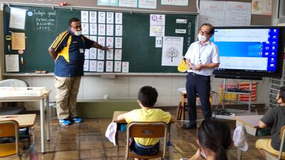 ICT活用支援のために槁本慎一先生が来てくださいました。これから月に2回程度、タブレットやデジタル教科書を使っての操作や活用の支援をしてくださいます。