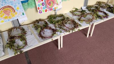 1年生は「生活科」の授業です。アサガオのつるをリース作りに使うために皆で協力してつるを集めています。どんなリースができあがるか楽しみです。今日は輪にするところまでの作業でした。