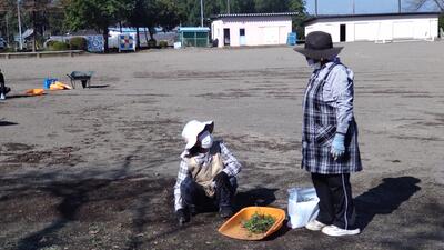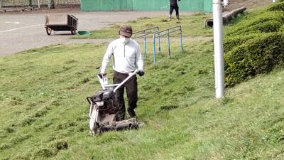 先週の土曜日に、見目智史PTA会長さんが校庭の芝刈りをしてくださいました。今週5日(土)の環境整備作業に先立ち、教頭とともに整備箇所を確認しながらの作業でした。ありがとうございました。