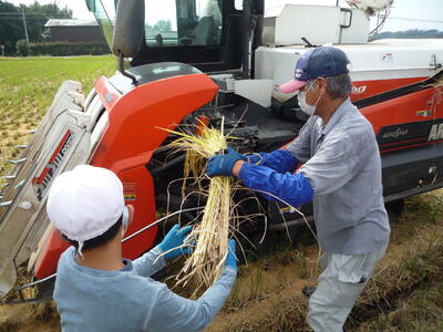 赤羽さんから稲刈りの手順等の説明を聞いた後、鎌で稲を刈っていきました。最初は、鎌の使い方に慣れずに苦労していましたが、すぐに慣れたようで、稲を手際よく刈り、コンバインに運んでいました。