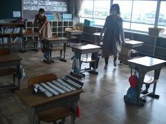 25日は入学式、27日は2~5学年の登校日、25日~29日は6年生の登校日になります。本日教室等の机や、手洗いの場所の目印のテープを張りました。