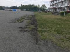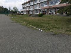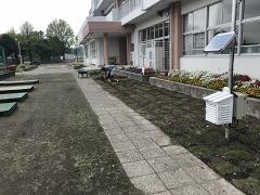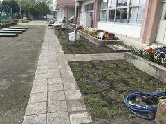 校庭北側の芝生をカットし、カットした芝生を校舎前に移植しました。