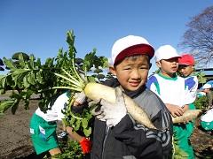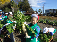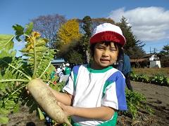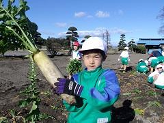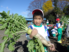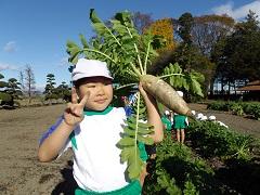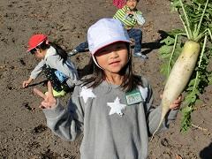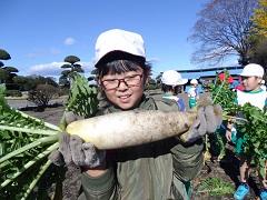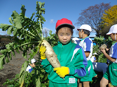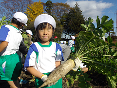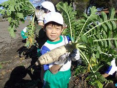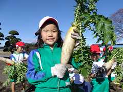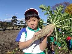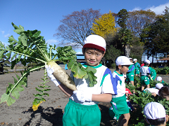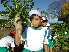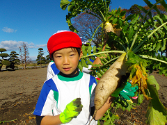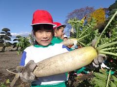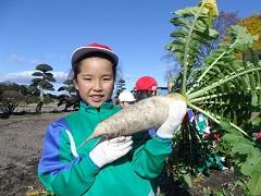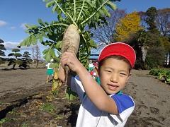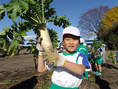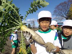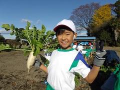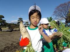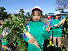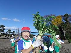 1・2年生が学校農園で育てているだいこんの収穫を行いました。さつまいもと同様に例年になく大きくてりっぱなだいこんが収穫できました。
