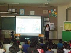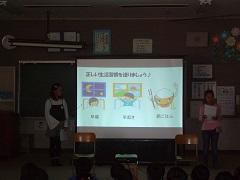 町立学校給食センターの学校栄養士が来校し、4年生対象に食指導が行われました。「元気な体に必要な食事」というテーマで、栄養素を確認した後、主食・主菜・副菜のバランスのとれた食事の重要さについて話を聞きました。子どもたちはよく話を聞き、質問に対して意欲的に答えていました。