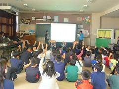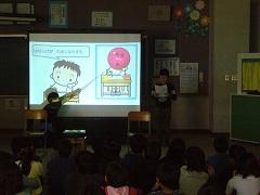 1年生対象に交通安全講話を行いました。この事業は、積水ハウス宇都宮支店との包括連携協定の一環で、株式会社 オーリアル 大塚社長を講師とし、講話及び反射材グリミスの配布を通して、交通事故のために命を落としたり、車いすでの生活を余儀なくされたりすることのないようよう事故防止の啓発を目的としています。子どもたちは大塚社長の講話をよく聞き、たくさんの質問をしました。また、反射材グリミスをいただき大喜びでした。