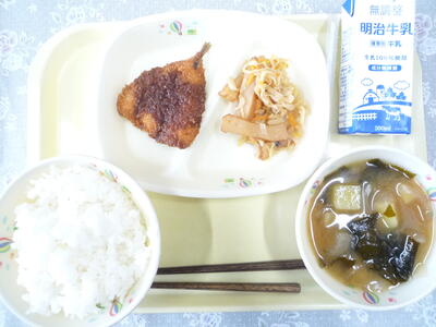 本日は、「かみかみメニュー」として、「ご飯」、「牛乳」、「アジフライ」、「切り干し大根の煮物」、「ジャガイモとワカメの味噌汁」が提供されました。今日も美味しくいただきました。ごちそうさまでした。