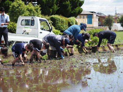 ちょうど1カ月前の4月25日(火)に、「米作りスタート!」として、5年生の種籾をまく作業を紹介しましたが、その後順調に苗が成長し、本日無事に田植えを実施しました。赤羽啓一様に手順を説明していただき、早速作業を開始しました。最初は、手こずっていた5年生ですが、あっという間にコツをマスターし、手際よく苗を植えることができました。予定の時刻よりも早めに終了しました。赤羽さんをはじめ、お忙しいところ協力していただきました保護者の皆様、地域の皆様、本当にありがとうございました。なお、町生涯学習課の方が取材、写真撮影に来てくださり、後日田植えの様子が「たんたんだより」で紹介されます。