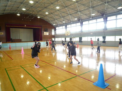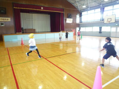 1,2年生は、合同で体育の授業です。新体力テストの練習をしています。写真は、「反復横跳び」の様子です。