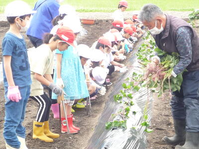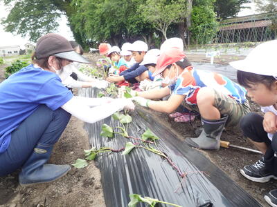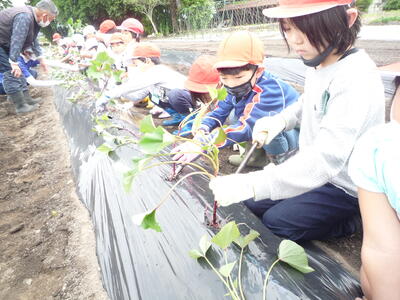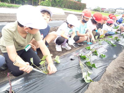1,2年生が、サツマイモの苗を植えました。品種は、「ベニハルカ」と「アンノウイモ」です。野中先生に手順を教えていただき、専用の道具を使って1年生と2年生が協力して植えました。甘くておいしいサツマイモを収穫するのが楽しみですね。畑を貸してくださっている岩本様、畝作り等の準備をしてくださった相澤様、毎年ありがとうございます。