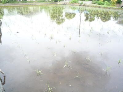 24日(水)に5年生が植えた「ゆうだい21」の苗の様子です。周りの水田に見劣りすることなく、落ち着いています。このまま順調に成長してくれることでしょう。