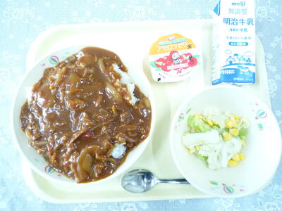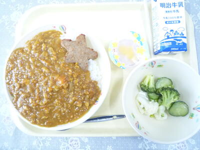 本日のメニューは、「七夕ハンバーグカレー(ご飯・星形ハンバーグ・カレー)」、「牛乳」、「グリーンサラダ」、「七夕デザート(レモン・ブドウ味ゼリー)」です。画面では見にくいですが、カレーのプレートの右上に「星形ハンバーグ」があります。今日も美味しくいただきました。ごちそうさまでした。