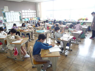 3年生は、算数のわり算に取り組んでいます。この時間は、文章問題にチャレンジしています。