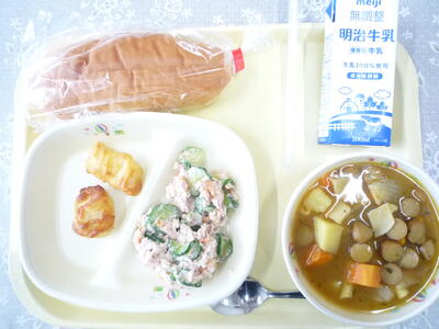 本日のメニューは、「セルフツナサンド(牛乳パン、ツナサラダ)」、「牛乳」、「チキンナゲット」、「マカロニカレースープ」です。写真では分かりにくいかもしれませんが、パンに切れ目が入っていて、そこにプレート右側のツナサラダを各自(「セルフ」)はさんで食べるシステムです。今日も美味しくいただきました。ごちそうさまでした。