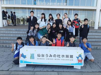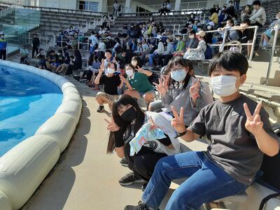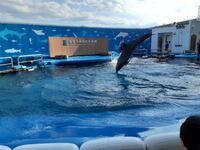 水族館に着きました。お土産を買ったり海の生物を見学したりしました。イルカのショーでは最前列に陣取り、水しぶきを浴びていました。