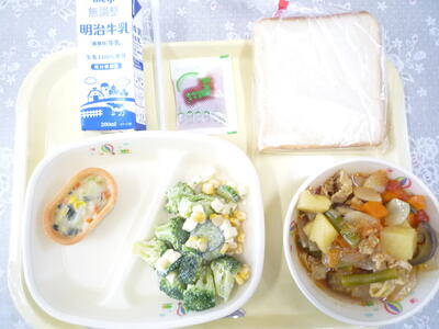 本日のメニューは、「食パン」、「とちおとめジャム」、「牛乳」、「野菜グラタン」、「ブロッコリーとチーズのサラダ」、「ビルマ汁」です。「ビルマ汁」は、たっぷりの夏野菜を使って、カレー味でスパイシーに仕上げた益子町のご当地グルメです。今日も美味しくいただきました。ごちそうさまでした。