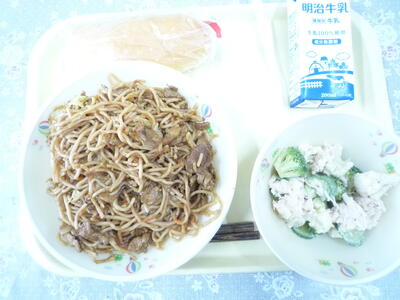 本日のメニューは、「焼きそば」、「牛乳」、「サラミソーセージとブロッコリーのサラダ」、「牛乳パン」です。今日も美味しくいただきました。ごちそうさまでした。