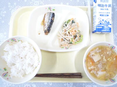 本日のメニューは、「むぎごはん」、「牛乳」、「サンマみぞれに」、「ごぼうサラダ」、「カンピョウ入りかきたま汁」です。今日も美味しくいただきました。ごちそうさまでした。