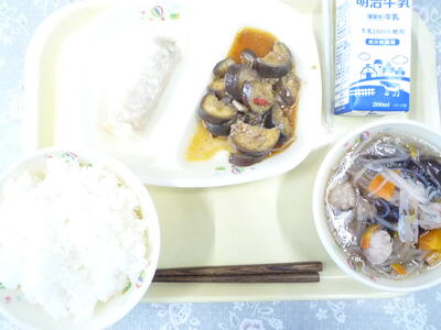 本日のメニューは、「ご飯」、「牛乳」、「ぎょうざロール」、「マーボーなす」、「肉団子スープ」です。今日も美味しくいただきました。ごちそうさまでした。