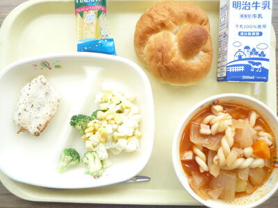 本日のメニューは、「米粉パン」「牛乳」「鶏肉のハーブ焼き」「コーンサラダ」「ミネストローネ」「パイナップル」です。冷凍パイナップルは、給食では久しぶりの登場だと思います。今日も美味しくいただきました。ごちそうさまでした。