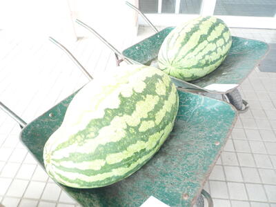 学校の農園で大きなスイカを収穫しました。重さを予想しています。