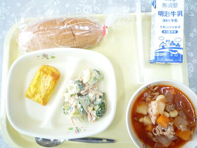 5月最初の給食は、牛乳パン、牛乳、肉団子トマトソース、コーンサラダ、白いんげん豆のポタージュでした。今日も美味しくいただきました。ごちそうさまでした。