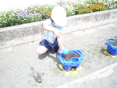 さわやかな晴天です。1年生と2年生の生活科の様子です。1年生は、アサガオの種をまきました。「元気に芽を出してね。」と気持ちをこめて、お水もたっぷりあげています。2年生は、野菜の苗の観察です。一人一人がキュウリやピーマン、ナスなど自分で選んだ野菜を育てています。アサガオも野菜も成長が楽しみですね。